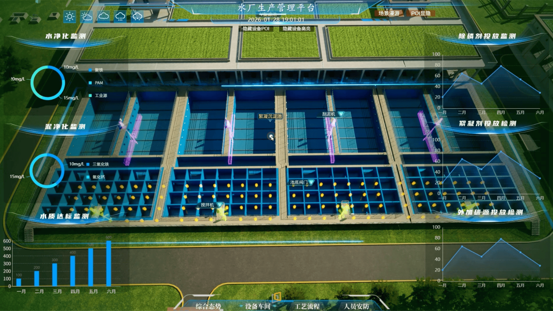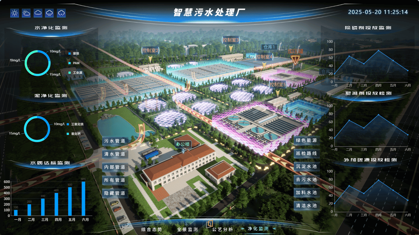 围绕水质达标、设备实时运行、节能增效等生产、运营和管理目标,用CIMPro轻松搭建智慧污水处理厂管理系统,平台集污水处理厂区建筑及生产设备、管线等设施的三维场景,将污水厂实时运行信息、日常管理信息进行智慧管控,可确保园区及设备以科学、高效、安全、智慧的状态可视化运行和管理。