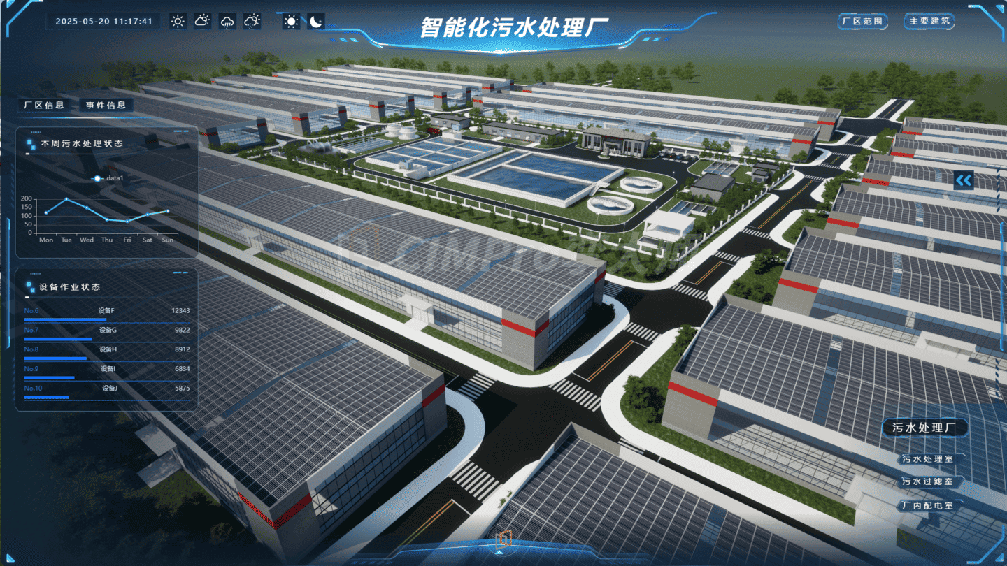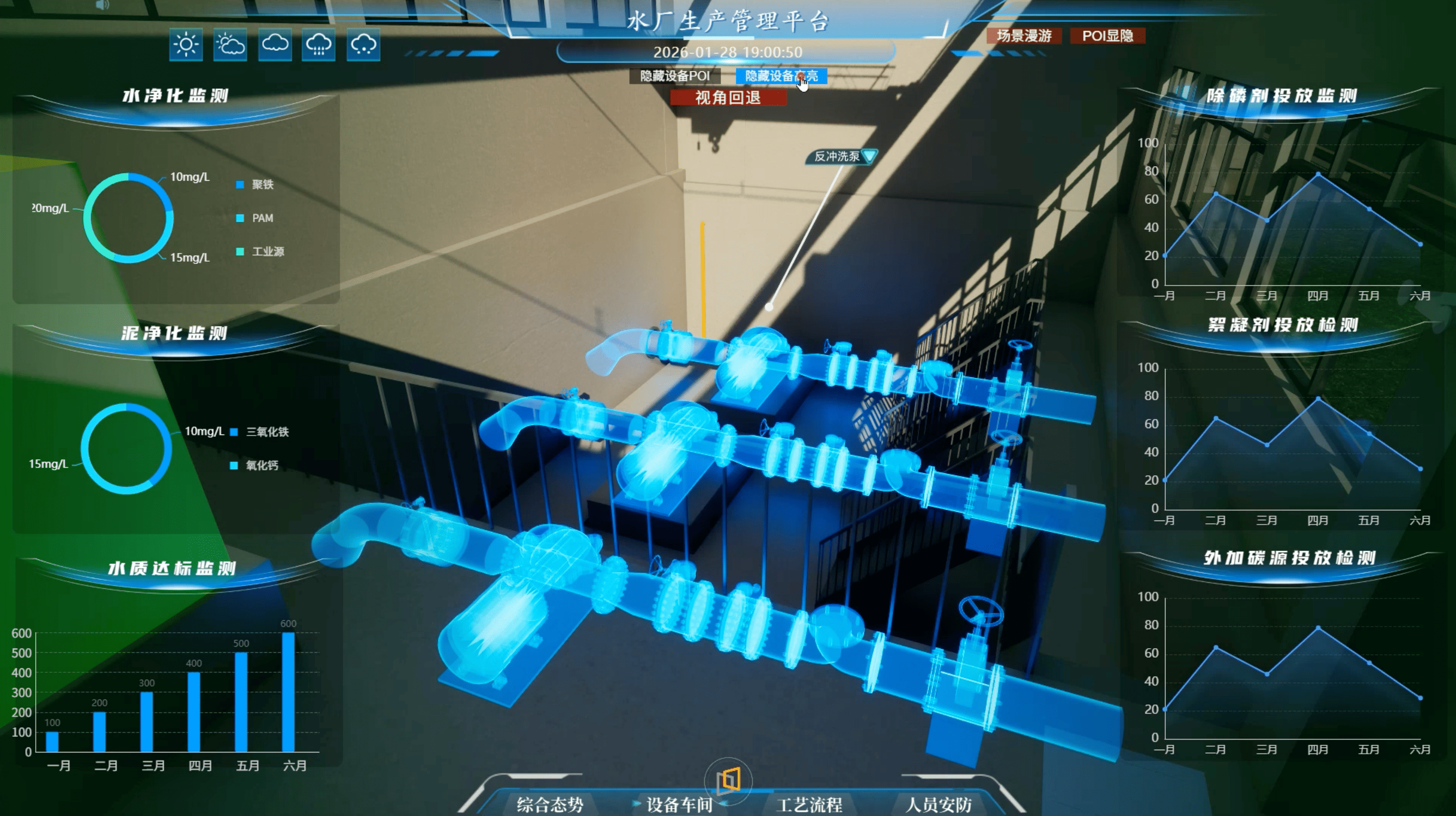 按照真实工艺流程1:1复刻全要素三维模型,包括泵站、水厂、管网系统模型(原水管、输配水管、雨水管、污水管、排泥管等)、关键设施模型(沉淀池、膜滤池、加药间、清水池、变电所等)、环境关联模型(高精度地形、道路、河流等GIS数据、降雨积水区等)等。