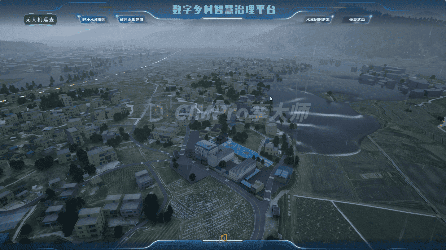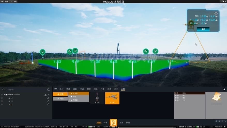 支持水体效果模拟(波纹、流动、水位变化),可结合降雨和水文模型实现洪水演进与淹没分析。参数可调(如容器尺寸、出水时间),支持碰撞效果,并兼容水利IoT数据接入。