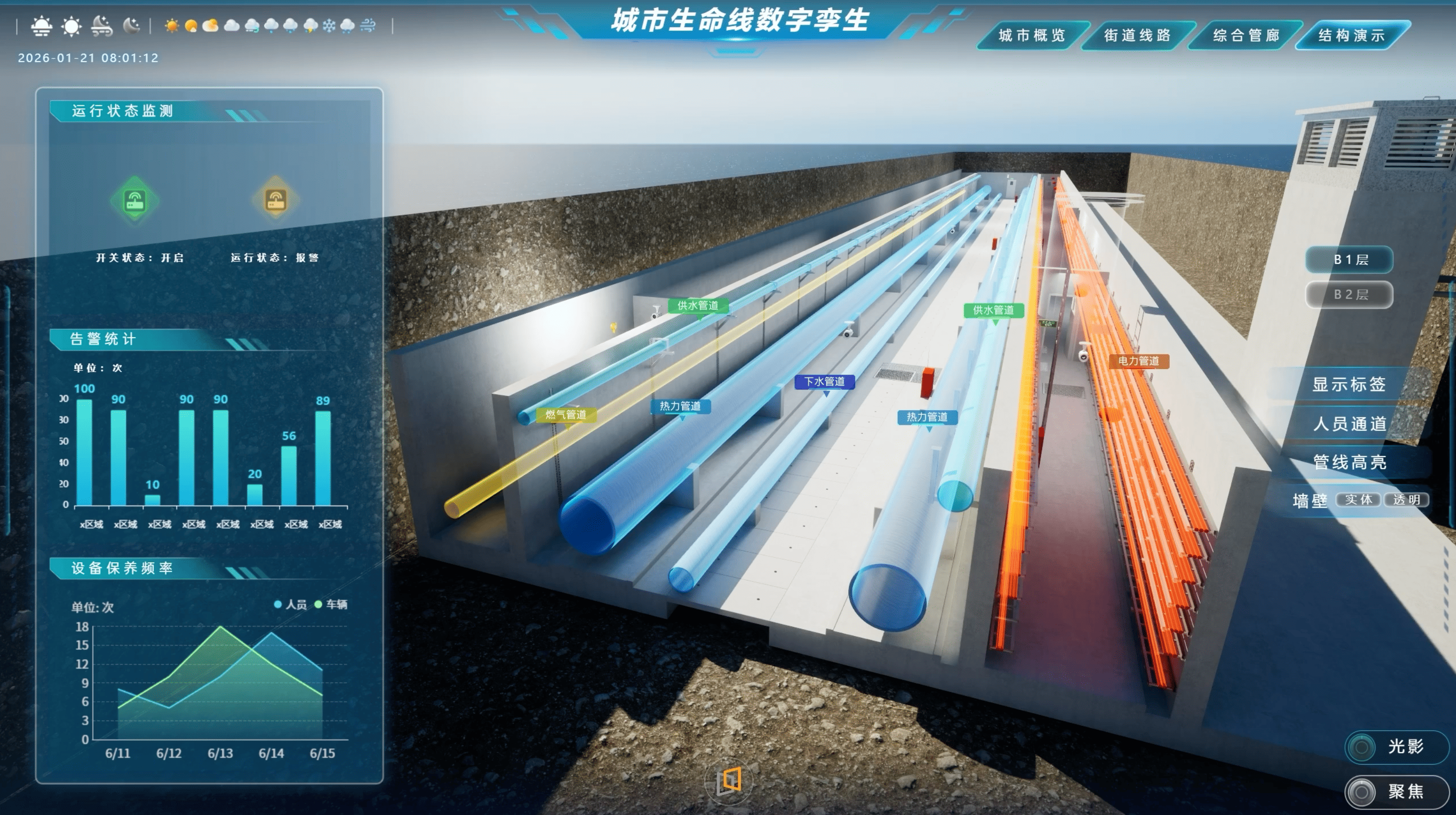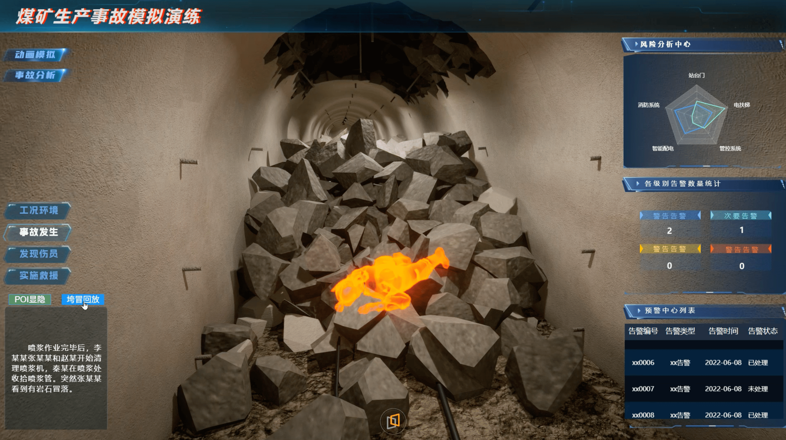 平台集成水淹模拟模块可推演暴雨等极端天气下的积水扩散路径与疏散方案。平台支持交通场景动态仿真,模拟不同客流压力下的通行效率与疏散路径,结合热力图实时呈现人流密度分布及趋势预测。全场景漫游功能支持管理者自由切换视角,沉浸式巡查设施布局与应急预案执行效果,显著提升地下交通枢纽的应急响应与安全管控能力。