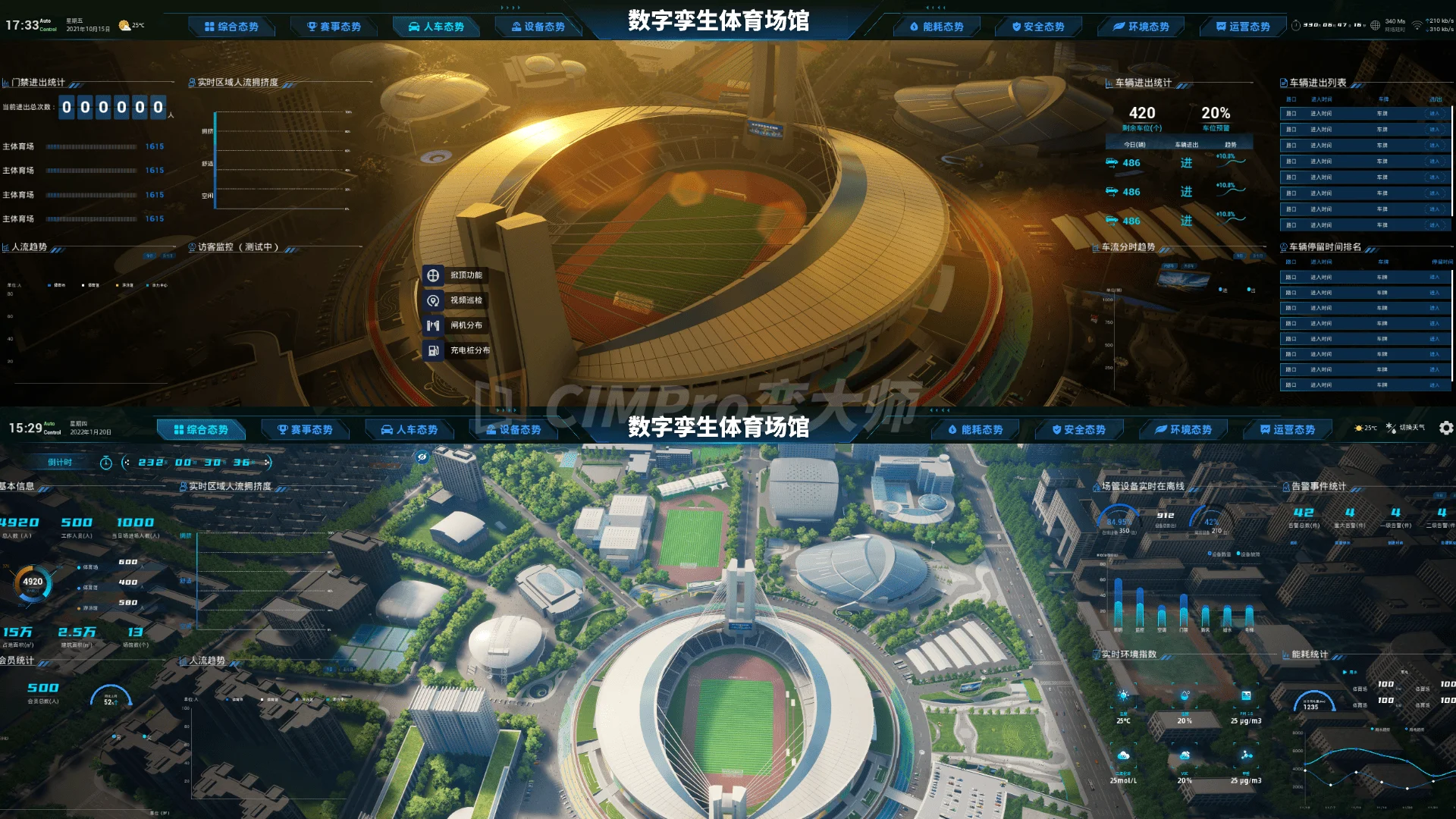 杭州某体育馆数字孪生通过CIMPro孪大师,构建三维可视化的全要素场景模型,集成场馆内4500余个设备及30余个运行系统的多源数据(如能耗、人流、设备状态等),实现实时监测与动态交互,为赛事指挥和安防调度提供毫秒级响应的可视化数据底座,最终实现“一屏统管”的智慧化运维目标。