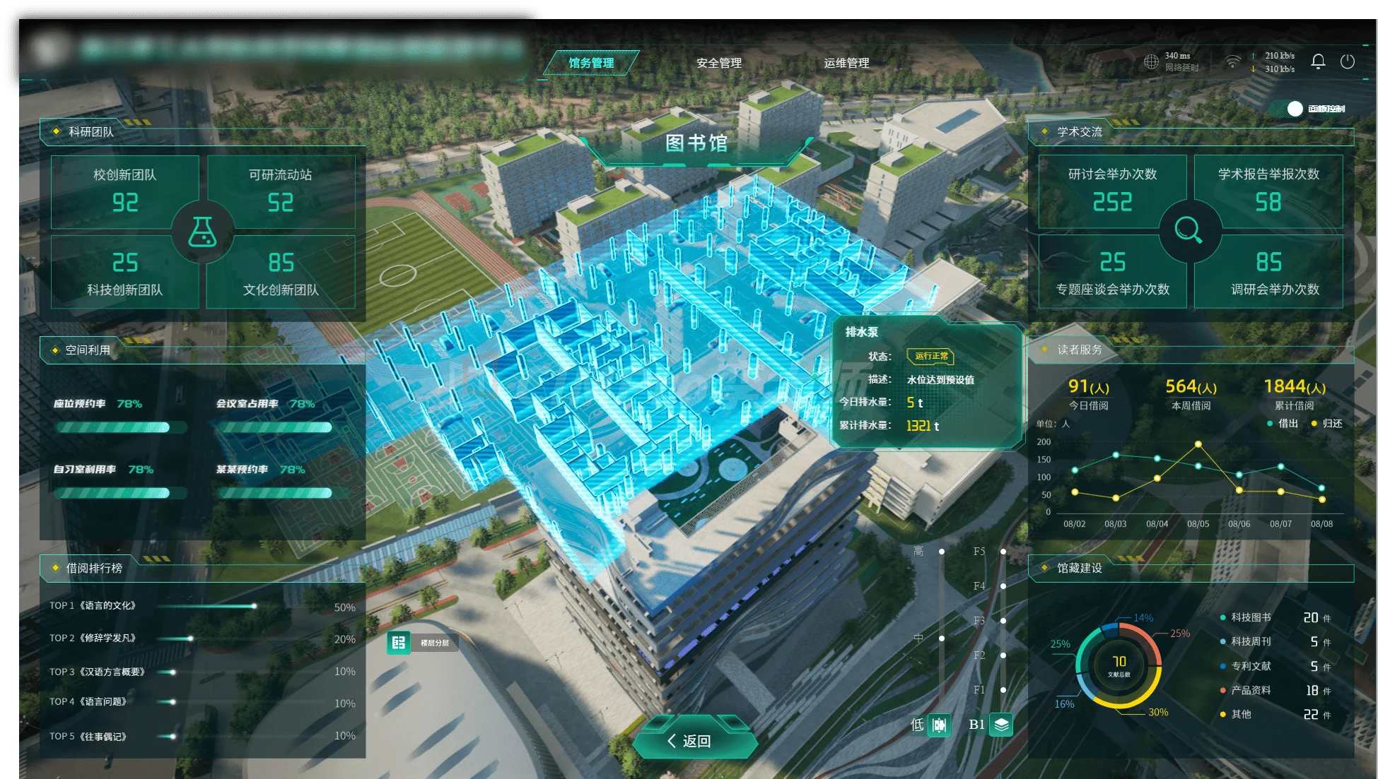 提供三维场景结合2D数据面板为辅的可视化界面,全面展示展馆的布局、展品、参观者流动等信息。集成了外景、内景、导览、全局专题页面,为展馆管理者提供实时的展览数据和分析,支持展馆运营的优化和效率提升。支持零代码的拖拉拽编辑方式,支持私有化部署。