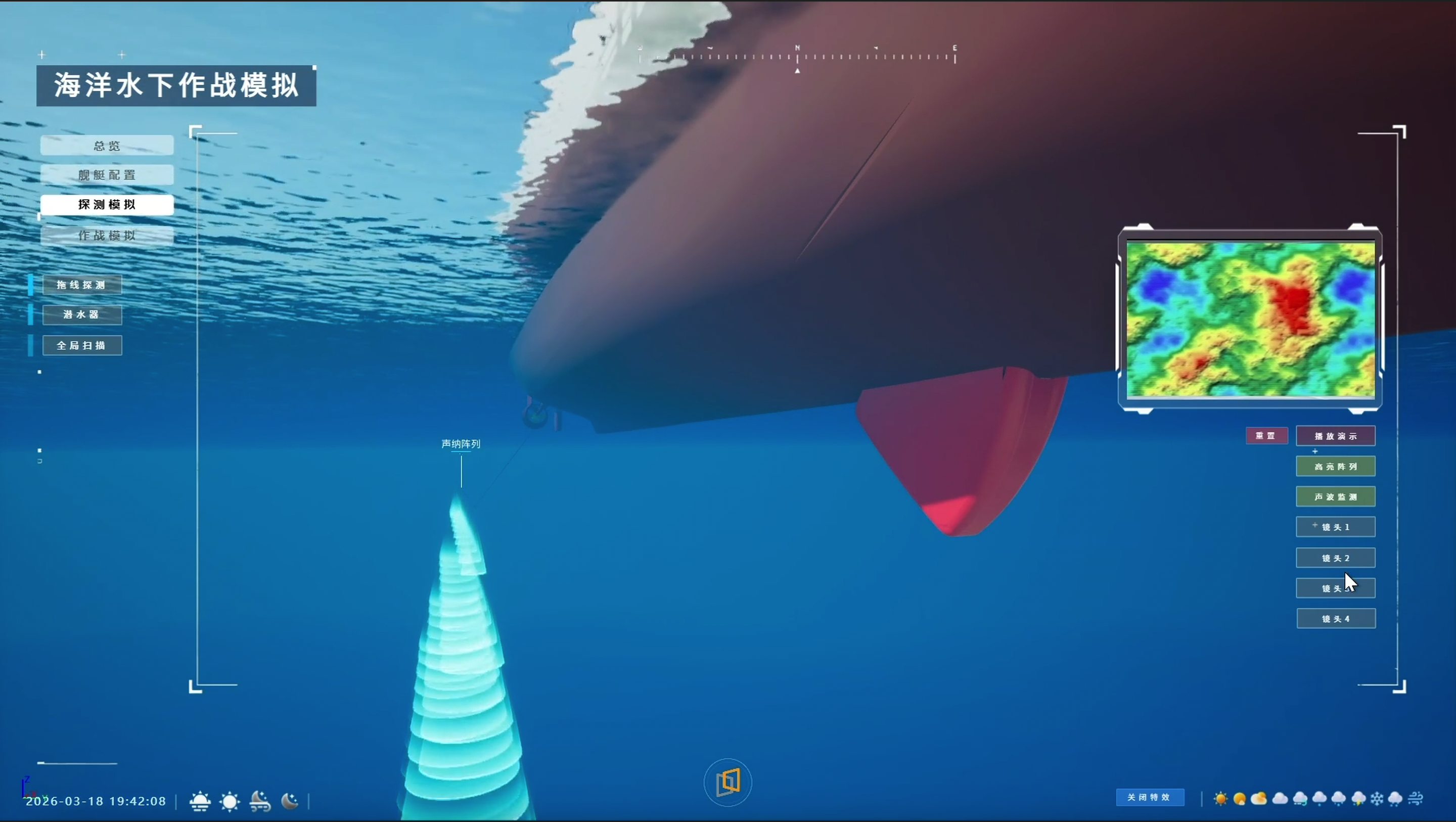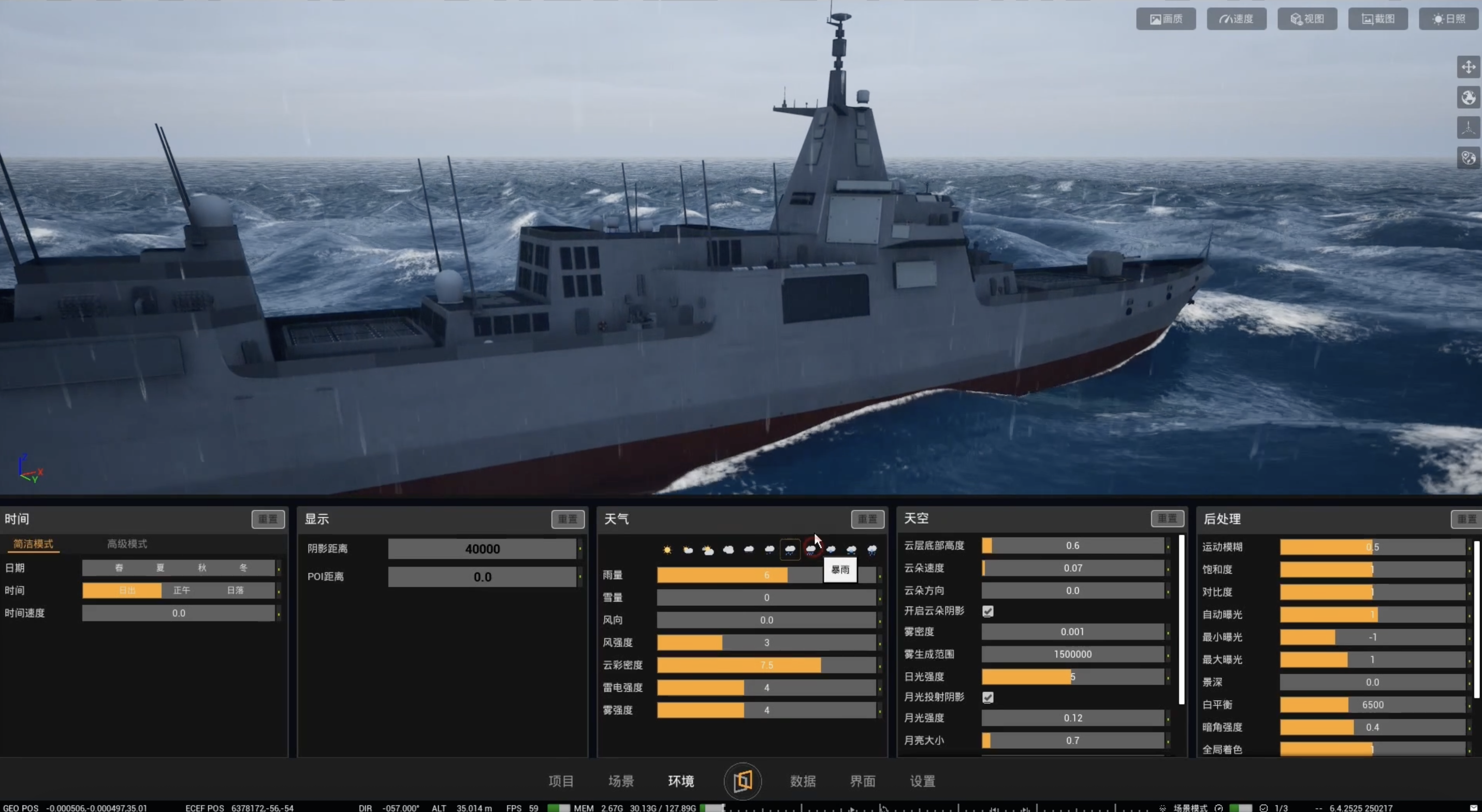 海浪形态和特性参数化管理,例如海浪高度、波长、波峰间距、波的陡度以及海浪的方向和频率等,实时物理模拟和交互计算,实现海浪与船体之间真实交互。