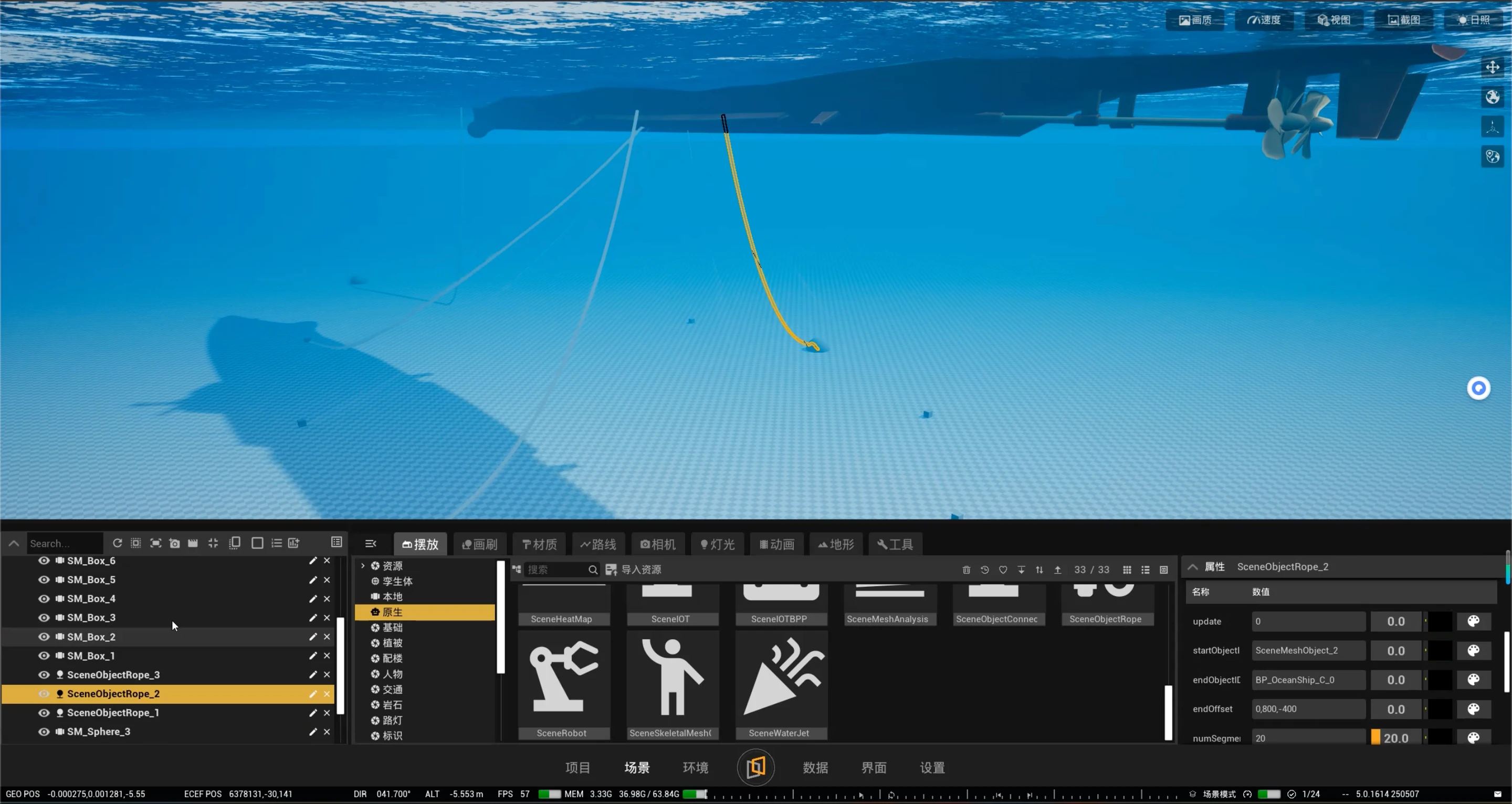 内置地理坐标系,支持导入、融合和处理各种格式的GIS数据(如高程模型DEM、OSGB、高斯泼溅),便捷化构建海洋地形、水深、海流、海洋生态等地理环境。